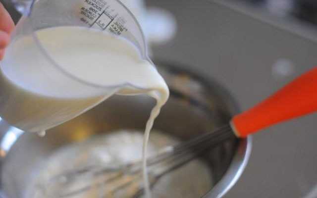 3. Тонкой струйкой вливать молоко комнатной температуры, помешивать венчиком, чтобы не оставалось комков.