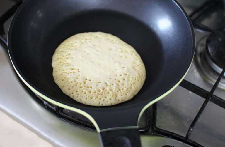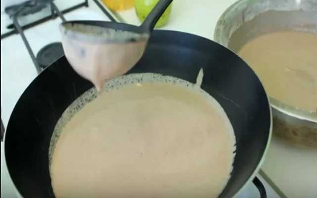 - Наливать тесто нужно на горячую сковороду. Для этого можете использовать половник.