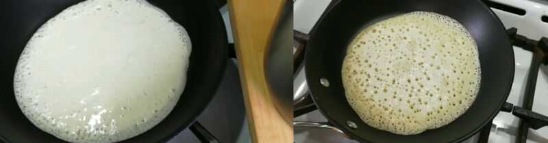 Важно! Не пытайтесь перевернуть блин, пока не нем есть непропеченные места — порвется. Затем несколько секунд выпекаем с другой стороны и все, блин готов