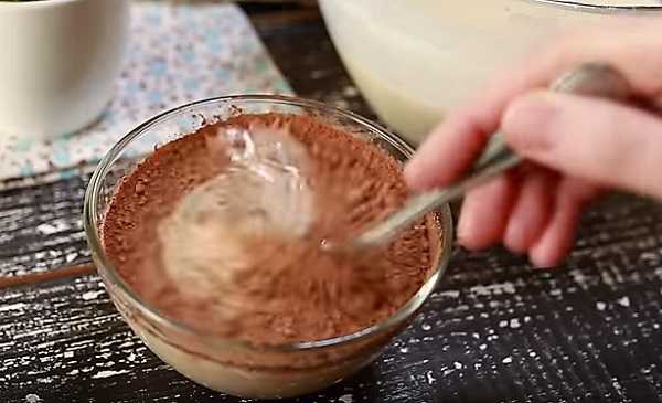 4. Небольшую часть готового теста отливаем в другую миску и добавляем какао порошок. Перемешаем до однородного состояния.