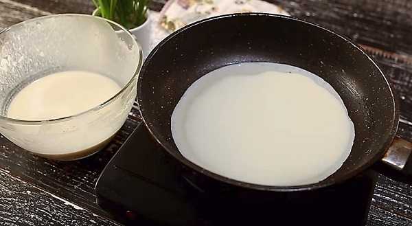 - Заместите тесто для блинчиков обычным способом — разведите муку с молоком и добавьте яйца, масло, сахарную пудру, мускатный орех, ром, соль.