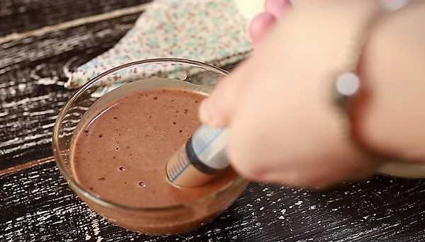 6. Пока блин не успел поджариться, набираем быстро в шприц жидкое тесто с коричневым какао.
