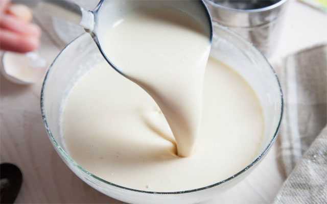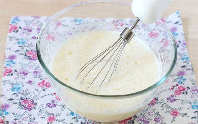 Смесь должна получиться достаточно густой. Затем разогрейте молоко до 80 градусов, не нужно доводить его до кипения, после чего влейте его в миску.