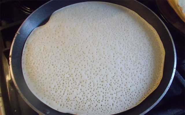 Для максимального увеличения наличия дырочек, блинное тесто необходимо оставить настояться. Желательно на час-полтора по времени. Так как тесто отдыхает, газы продолжают его рыхлить. К тому же процесс брожения продолжается дальше, создавая еще больше газов.