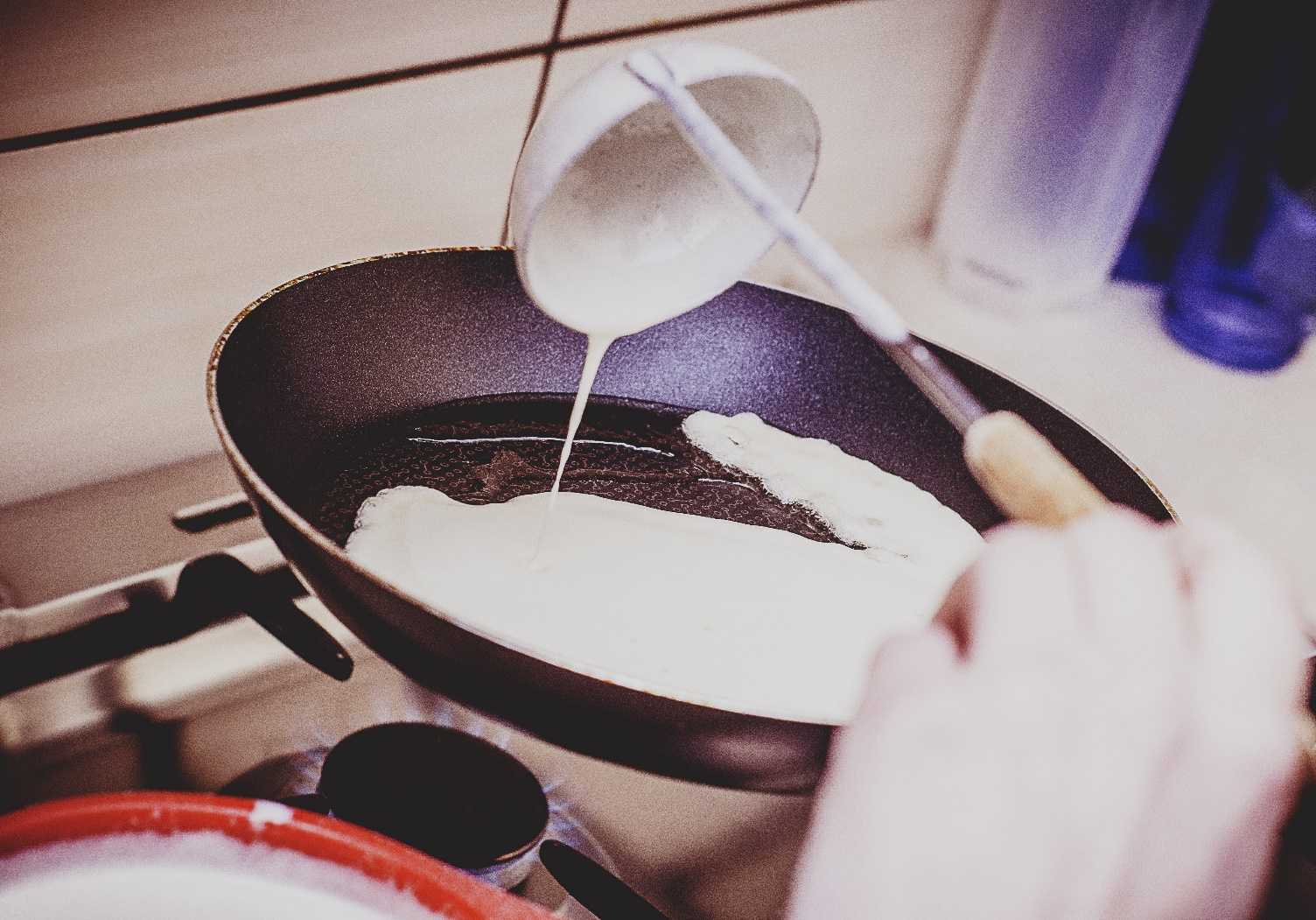- Для равномерного распределения слоя теста по сковороде ее необходимо держать под небольшим углом, наливая при этом тесто непосредственно в центр поверхности дна.