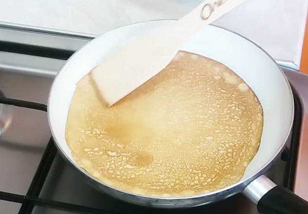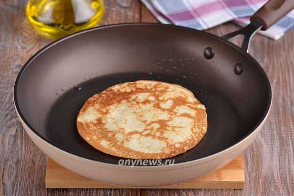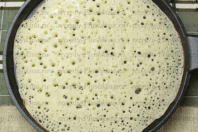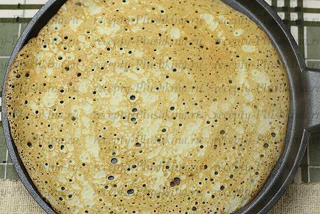 Так как тесто обладает хорошей текучестью, оно будет само растекаться по поверхности сковороды. Нужно сделать блин таким образом, чтобы слой теста на сковороде был примерно 4-5 мм