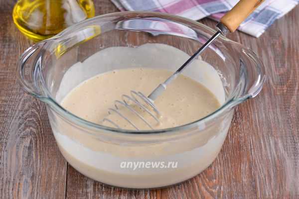 Вот теперь уже нужно присматриваться – какое получается? Жидкое, стекает с ложки как молоко? Или начинает густеть и чувствуется, что льется не совсем свободно? В зависимости от густоты добавляем 2-3 ложки муки, но уже без горы. Взбиваем до однородности, в тесте не должно быть никаких комочков.