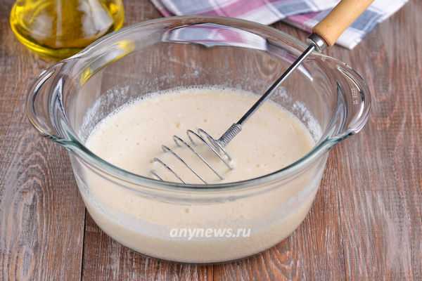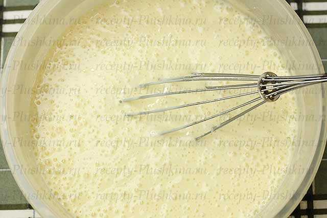Размешиваем. Теперь наблюдаем что происходит: через 1-2 минуты тесто наполнится пузырьками и увеличится в объеме раза в два, станет пышным. Вы почувствуете, что венчик в нем проворачивается легко, без усилий, консистенция будет густой, но рыхлой, воздушной.