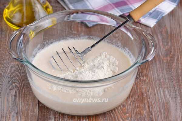5. Добавляем муку и перемешиваем до исчезновения комочков.