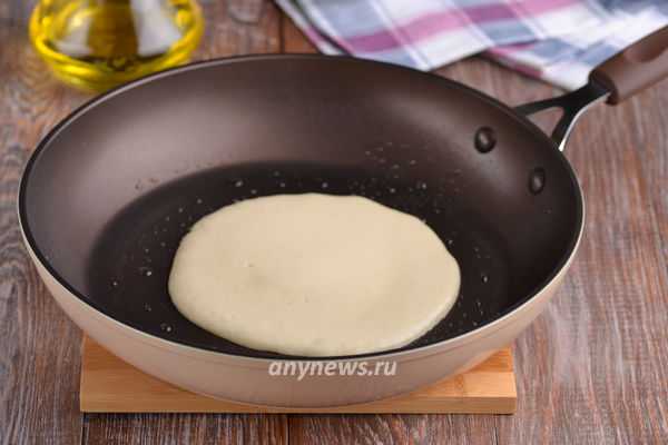 Далее вливаем из глубокой ложки тесто на сковороду и распределяем его в форме круга: круговыми движениями вращая сковороду, при этом держа ее за ручку. Так как тесто обладает хорошей текучестью, оно будет само растекаться по поверхности сковороды. Нужно сделать блин таким образом, чтобы слой теста на сковороде был примерно 4-5 мм.