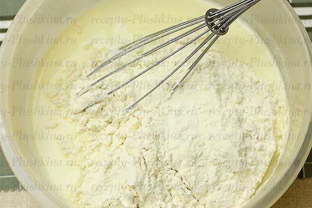 Муку просеиваем, высыпаем маленькими порциями и перемешиваем венчиком.