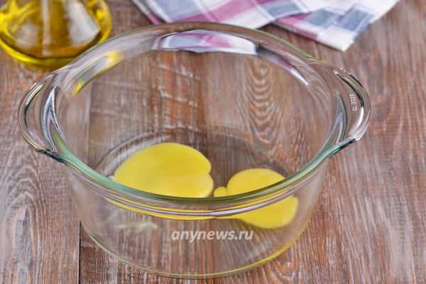 Для приготовления используем глубокую миску, в которую разбиваем яйца.