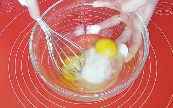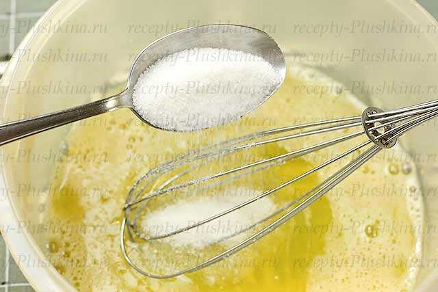 В кастрюлю взбейте куриные яйца и добавьте сахар.