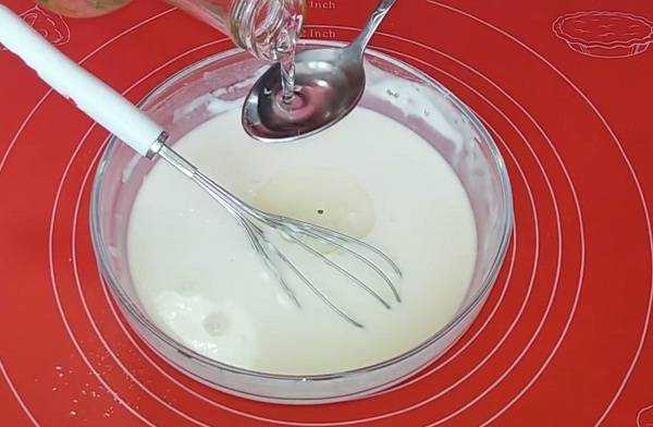 7. Заключающим ингредиентом у нас будет растительное масло, которое нужно смешать с блинным тестом.