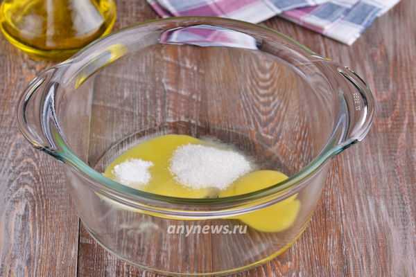 Яйца разбалтываем, добавляем мелкую соль и сахар. Я обхожусь обычным венчиком, миксер ради небольшой порции теста не хочется доставать. Вы делайте как вам удобнее.