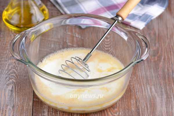 - Смешайте кефир с яйцами, солью, сахаром, содой и растительным маслом.