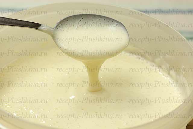 Чтобы вам было легче определить консистенцию теста, я покажу фото, какой она должна получиться. Ложку как бы обволакивает, сразу не стекает, льется ровно, ложится волнами и на поверхности остаются следы. По густоте напоминает сгущенку, только не плотное, а пышное. Оставляем его отстояться, отдохнуть на 10-15 минут.