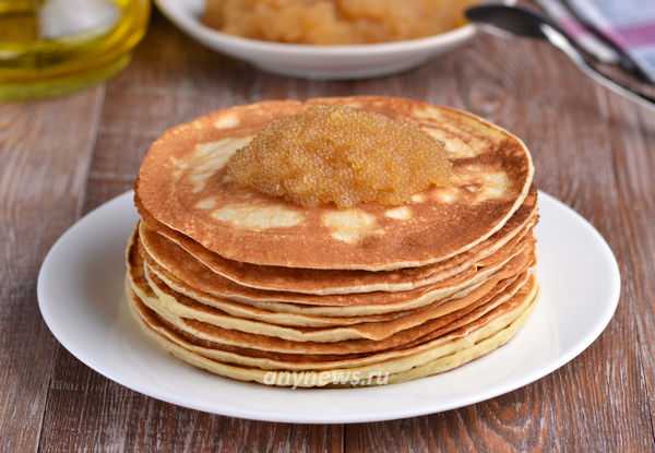 Готовые ароматные блины выкладываем на тарелку друг на друга. По желанию их можно смазать растопленным сливочным маслом. Подаем толстые блины на кефире с икрой, сгущенкой, сметаной, медом или любимым вареньем.