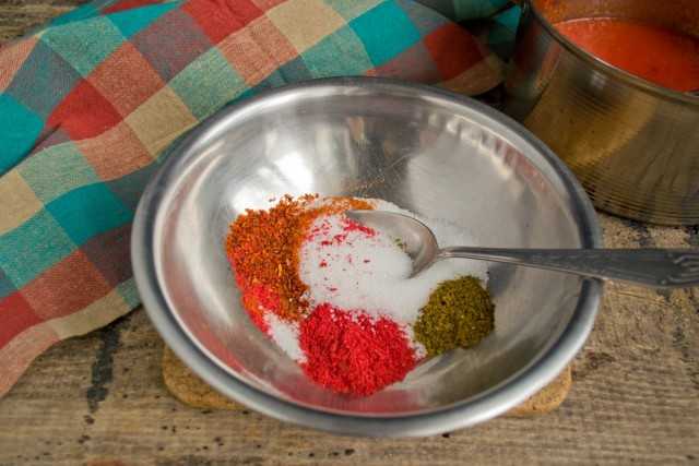 Отмеряем сахар, соль, добавляем хмели-сунели, сладкую и копченую паприку, жгучий молотый красный перец. Если овощное пюре сильно уварено, то нужно уменьшить количество соли и сахара по своему вкусу.
