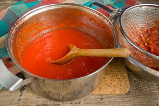 Теперь протираем тушеные овощи через дуршлаг или мелкое сито. Протираем тщательно, чтобы в остатке были только кожура и семечки. Овощное пюре снова возвращаем в кастрюлю. Увариваем на маленьком огне без крышки 15-20 минут.