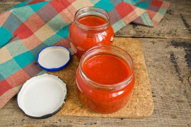Разливаем горячий соус в банки, закрываем крышками и отправляем на стерилизацию. Стерилизуем полулитровые банки 15 минут после закипания воды, плотно укупориваем. Переворачиваем банки вверх дном, после остывания убираем в кладовую.