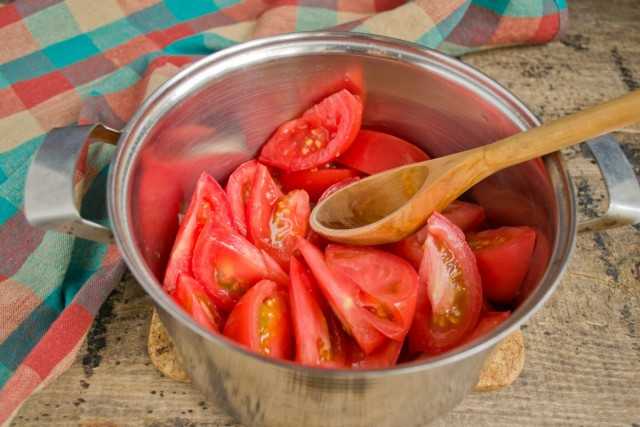 Моем помидоры, вырезаем плодоножку, нарезаем крупно. Кладём нарезанные томаты в глубокую кастрюлю