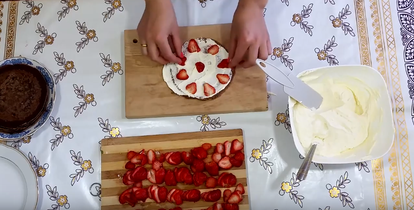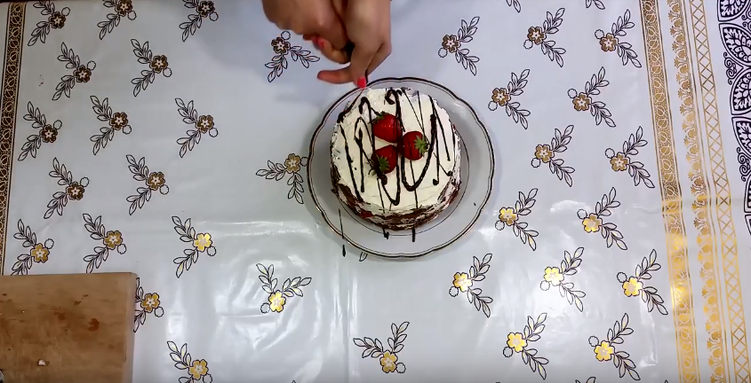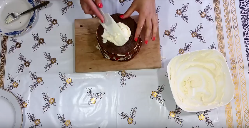 - Обработайте кремом края и верх торта и украсьте по своему желанию.