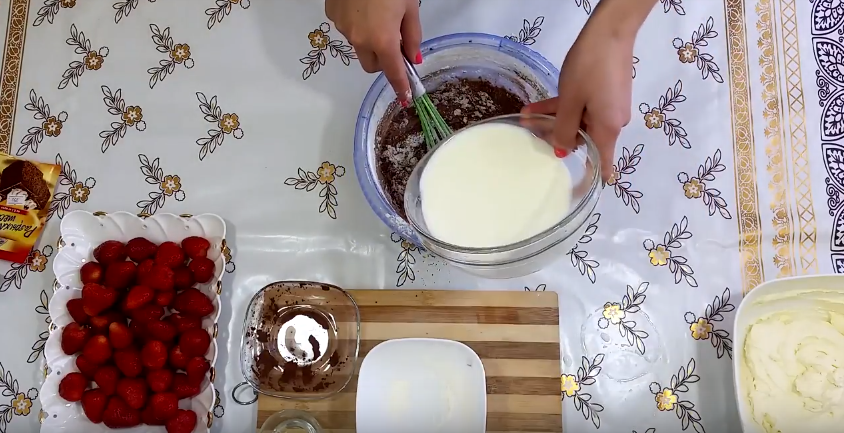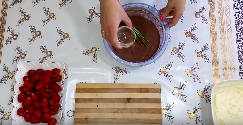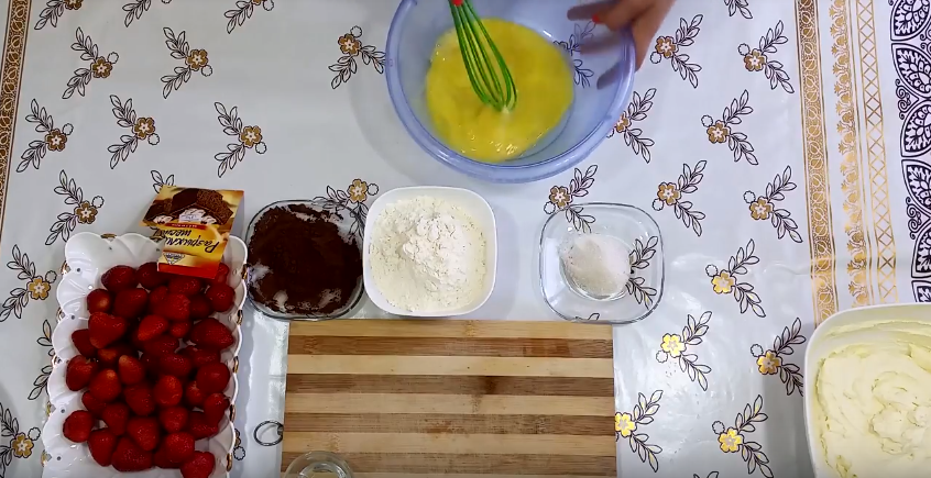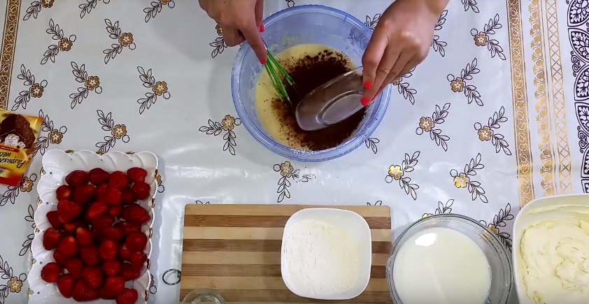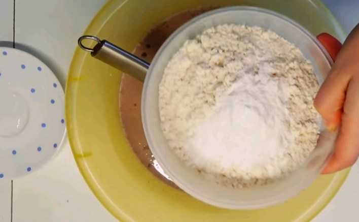 5. Когда половина теста уже будет добавлена, засыпаем в миску какао и продолжаем взбивать.