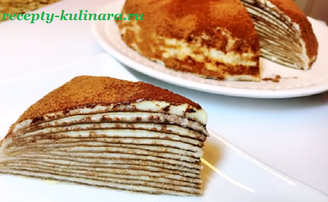 Этот рецепт появился в моей копилке недавно, но он уже завоевал любовь всей семьи. Нежный, кофейный торт с ароматом ванили просто тает во рту. Для любителей тирамису это будет настоящий подарок. Блины для него тоже будем печь не совсем обычные, с добавлением кофе и какао.