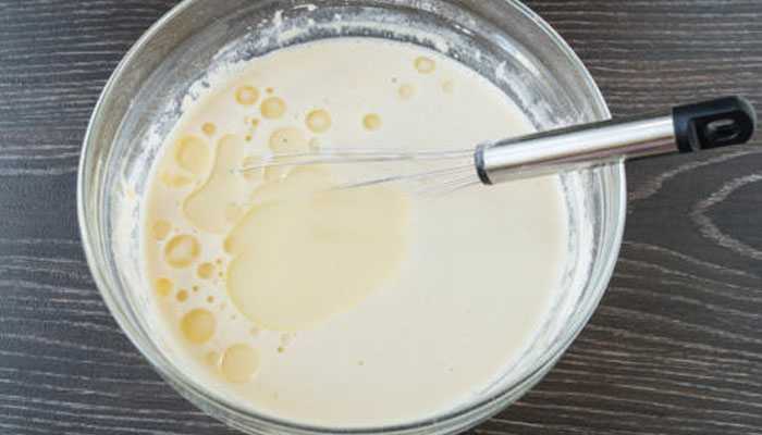 7. К готовому тесту добавляем растительного масла, еще раз размешиваем и можно приступать к выпечке блинов.