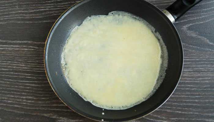 - Вылейте тесто, наклоняя сковродку п округу, чтобы оно равномерно распределилось тонким слоем. Нагрев держите сильный.