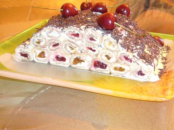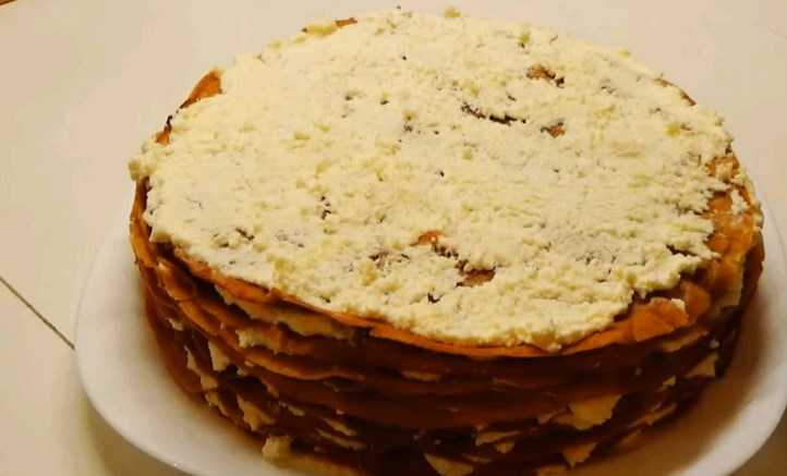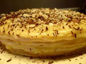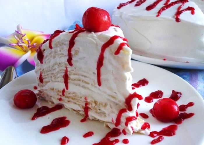 7. Продолжаем чередование прослоек до тех пор, пока не закончатся наши тонкие эластичные «коржи». Ставим готовый торт в холодильник как минимум на пару часов, чтобы он пропитался и крем хорошенько загустел, тем самым «сцепив» торт в единое целое. Тогда при нарезке нож не будет скользить и стягивать за собой кусок частями – будут получаться красивые ровные срезы.