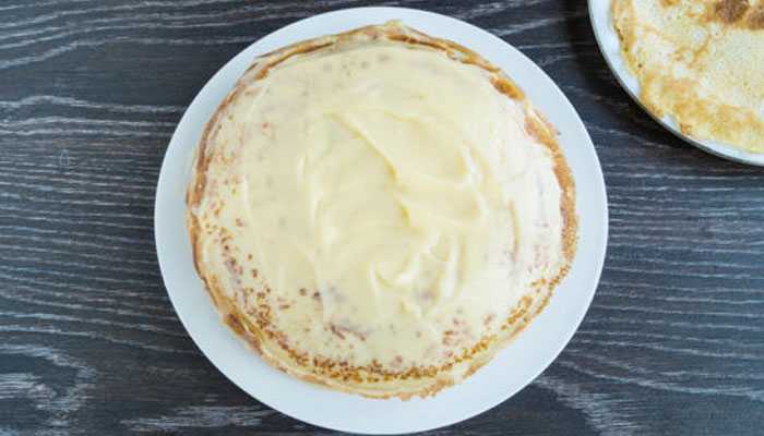 6. Приступаем к формированию. Кладем первый кругляш на блюдо и сверху кладем ложку заварного крема. Распределяем его тонким слоем по всей поверхности и накрываем следующим блином.