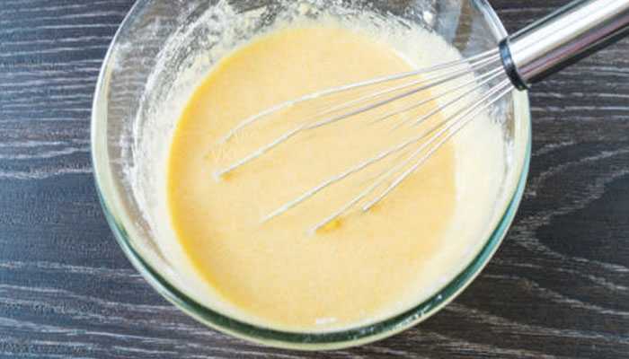 - Просеиваем муку. Смешиваем все ингредиенты венчиком, чтобы не было комков.