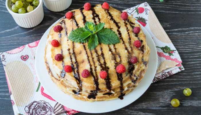 Собирать блинный торт лучше всего на плоской поверхности, застелив её пергаментом. На блин выкладывать сметанный крем и накрывать следующим блином.