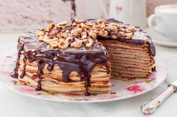 • Собирается он очень просто — блины укладываем друг на друга промазывая каждый хорошей порцией крема. Можно это делать лопаткой или столовой ложкой. Когда торт полностью собран, верх присыпаем через ситечко порошком какао. На два часа отправляем его пропитываться и застывать в холодильнике.