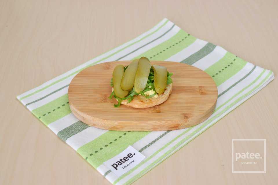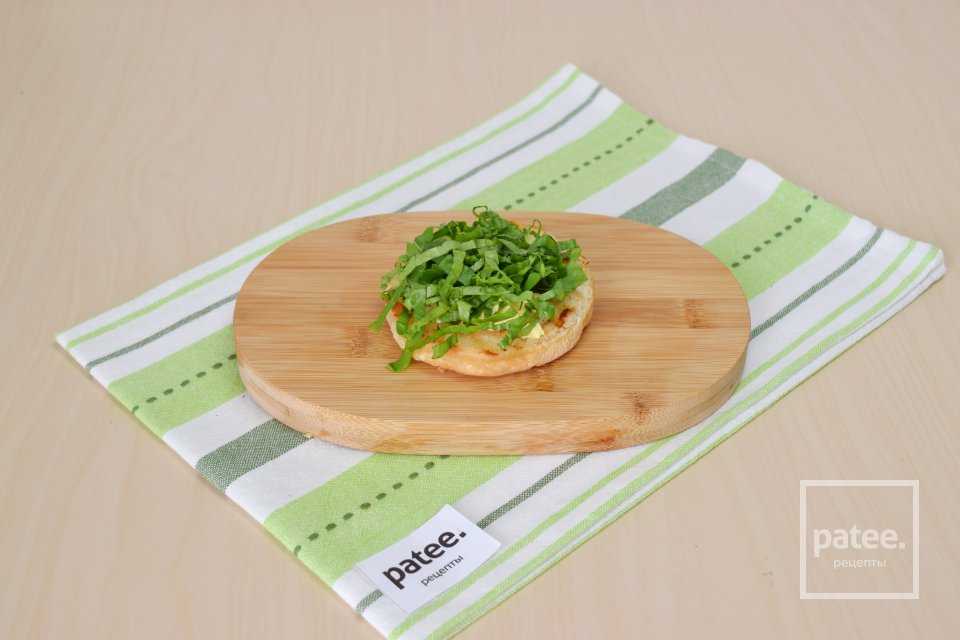 Листья салата моем под проточной водой, обсушиваем бумажным полотенцем и нарезаем тонкой соломкой. Выкладываем салат на булочку.