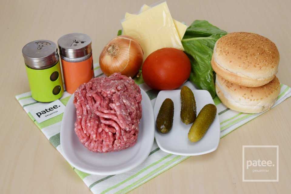 Для приготовления бургеров нам понадобятся: булочки для гамбургеров, говяжий фарш, маринованные огурцы, помидор, листья салата, соус, лук, сыр, соль и перец.