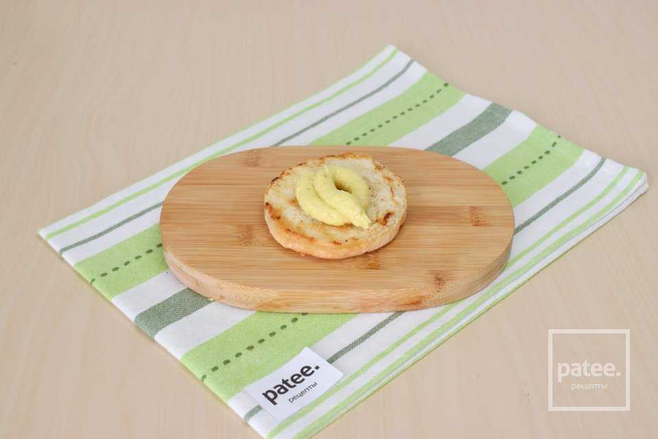 Нижний кусок подсушенного хлеба смазываем майонезом