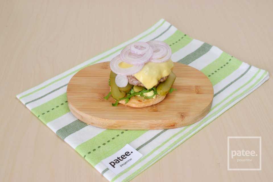 Для бургеров лучше использовать фиолетовый лук, он сочнее и слаще. Лук нарезаем тонкими кольцами, выкладываем его поверх котлеты.