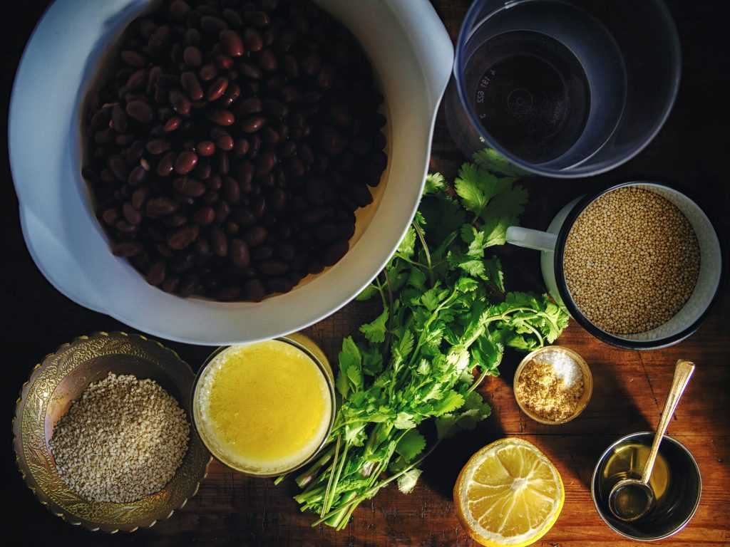 Киноа промываем (это важно, чтобы крупа не горчила), отвариваем в двух стаканах воды на среднем огне минут 15 до выкипания всей воды. Фасоль измельчаем блендером