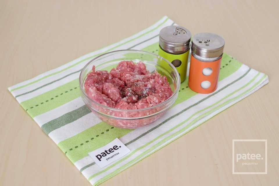 Говяжий фарш для котлеты лучше всего пропустить через мясорубку дважды для получения более мелкого фарша. Выкладываем фарш в миску, добавляем соль и перец. Хорошо вымешиваем и отбиваем фарш.