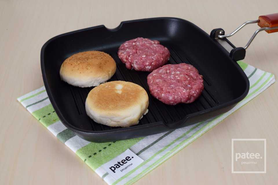 Сковороду гриль ставим на огонь и даем ей прогреться. Выкладываем на сковороду котлеты и половинки булочек для бургеров. Обжариваем булочки до румяности по 3 минуты с каждой стороны.