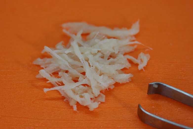 Листья нори нарезать тонкими полосками. Они хорошо режутся острыми ножницами. Величина полосок не играет особой роли. Количество листьев можно увеличить или уменьшить на свой вкус.