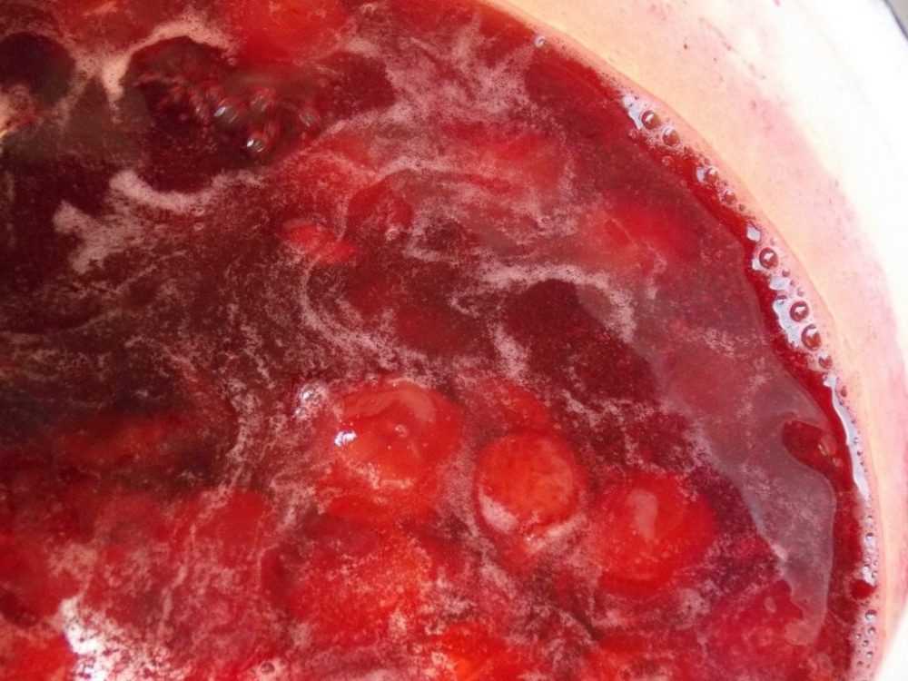 Продолжая мешать, довести вишневый кисель до кипения. На очень слабом огне кипятить вишневый кисель не более 2 мин и сразу же снять с огня.