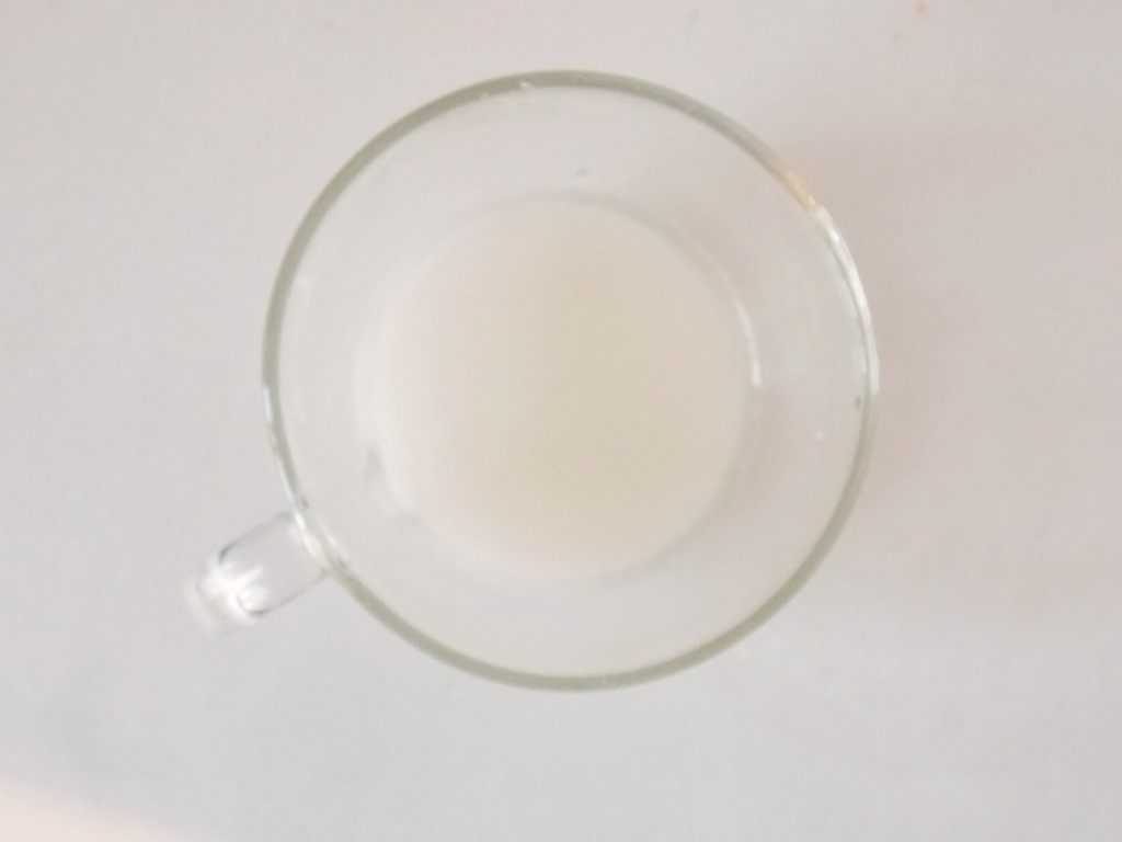 Тем временем, насыпав крахмал в чашку, вливаем туда оставшуюся воду. Тщательно размешиваем, чтобы не осталось комков, и крахмал полностью растворился.