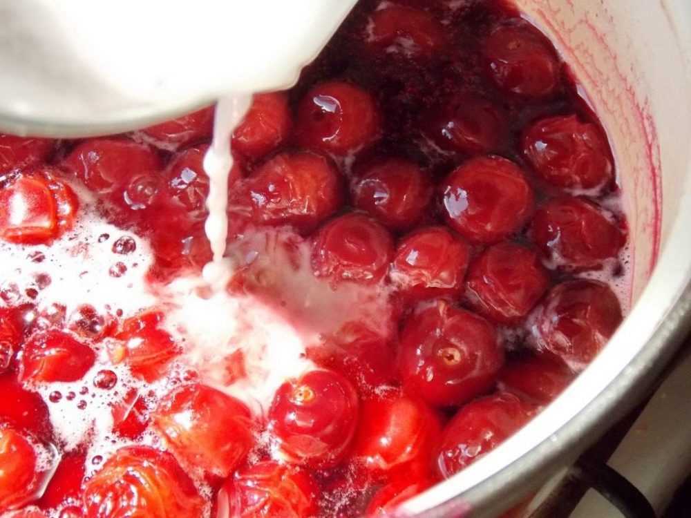 Воду наливаем в эмалированную кастрюльку, немного (с четверть стакана оставляем). Доводим воду в кастрюле до кипения, высыпаем вишни и сахар.
