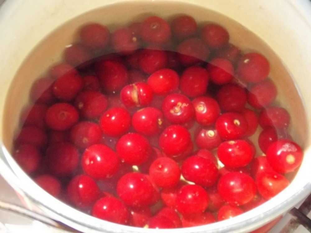 Доводим вишню до кипения, кипятим до готовности, обычно это 2-3 минуты и вынимаем из отвара. Я опять воспользовалась шумовкой.