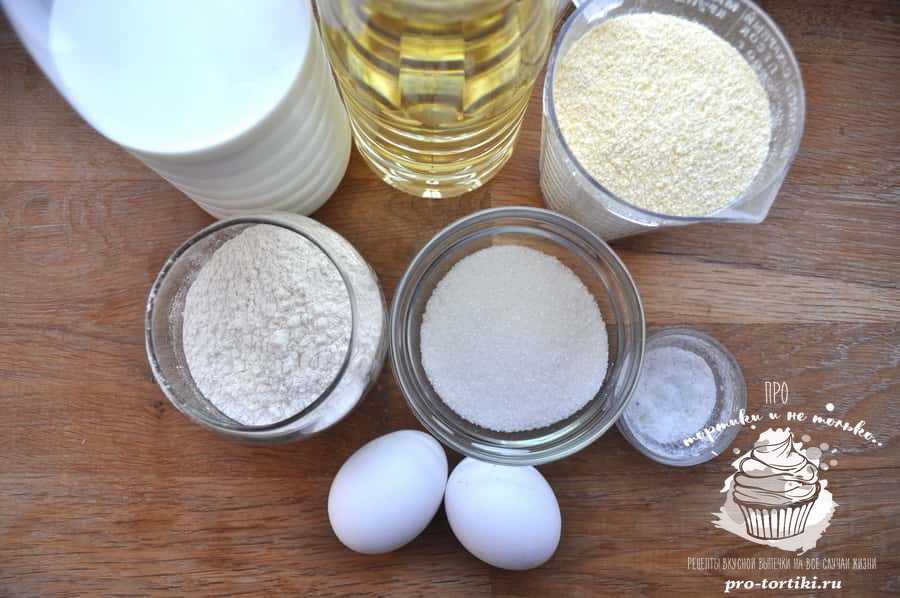 Крахмал кукурузный – около 200 г; яйца – 2 шт.; масло растительное – 50 мл (1/4 стакана); молоко – около 400 мл (примерно 2 стакана); сахар – 2 столовые ложки; соль – по вкусу.