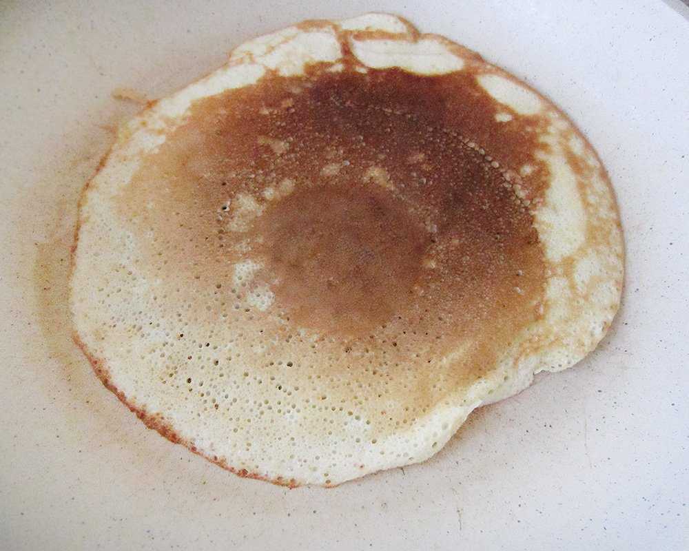 Даём тесту настояться на протяжении получаса. Выливаем тесто на хорошо промасленную и прогретую сковороду и прожариваем в течение 20 секунд с каждой из сторон.
